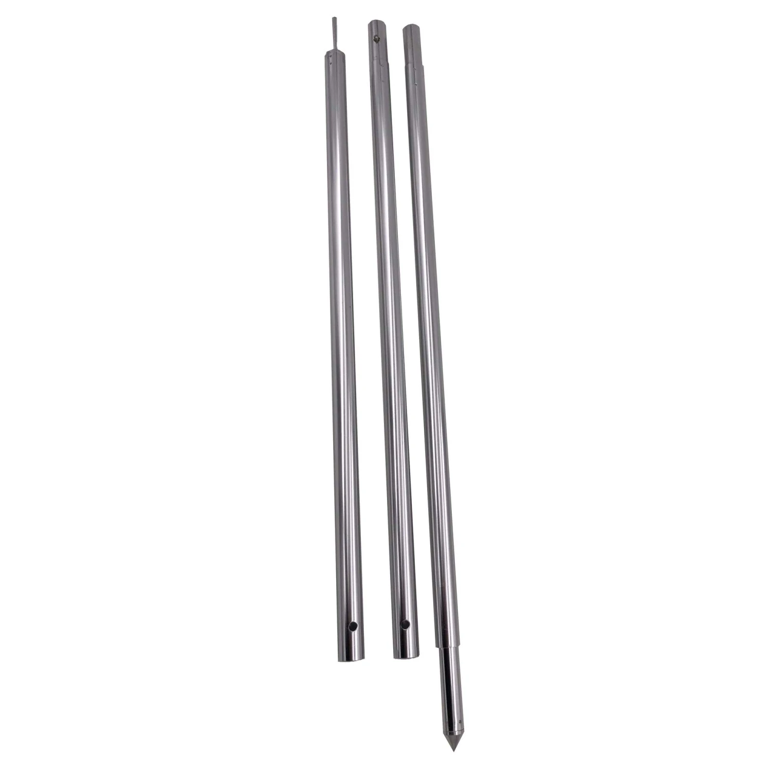 Die einzelnen Stangen besitzen eine Länge von 68 cm und werden mittels Druckklipsen verbunden. Anschließend kannst du die Höhe durch die Drehfixierung der Bodenspitze anpassen. Um in der Höhe noch variabler zu bleiben, kannst du eines oder gleich beide Mittelteile weglassen und nur das Unterteil mit dem Oberteil verbiniden. Der Durchmesser der Stangen von 22/19 mm erlaubt einen universellen Einsatz.