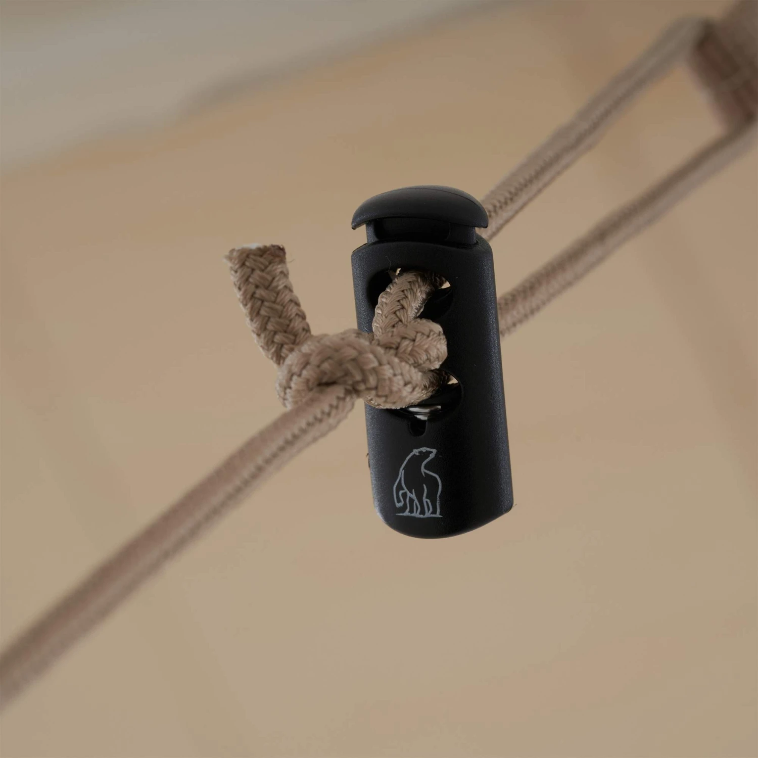Das Baumwolltarp wird mit stabilen Aufstellstangen (höhenverstellbar) und dicken Abspannleinen mit Heringen geliefert. Dadurch kannst du es unabhängig von einem Zelt überall aufstellen. Zwei ergänzende Abspannpunkte in der Mitte des Tarps ermöglichen zudem das vertikale Abspannen, z. B. an einem Baum. Zusätzlich ist ein mit Tarpaulin verstärkter Mittelpunkt eingesetzt, indem eine zusätzliche Stange, ein stabiler Ast oder ein Paddel einem Durchhängen des Materials entgegenwirkt. Damit die Stange nicht verrutscht, ist der Mittelpunkt von einem Nylonwulst eingefasst.